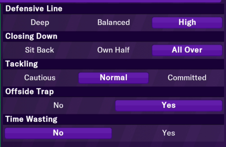 the team uses a high defensive line to squeeze the pitch and limit space for attackers. They proactively engage opponents everywhere on the field, ensuring constant pressure. Tackling is balanced—not too aggressive, yet not too passive. The bold offside trap aims to catch opponents unaware, but it demands perfect timing. Lastly, there's no time-wasting, signifying a team eager to keep the action moving. This setup paints a picture of a confident, assertive defensive approach.